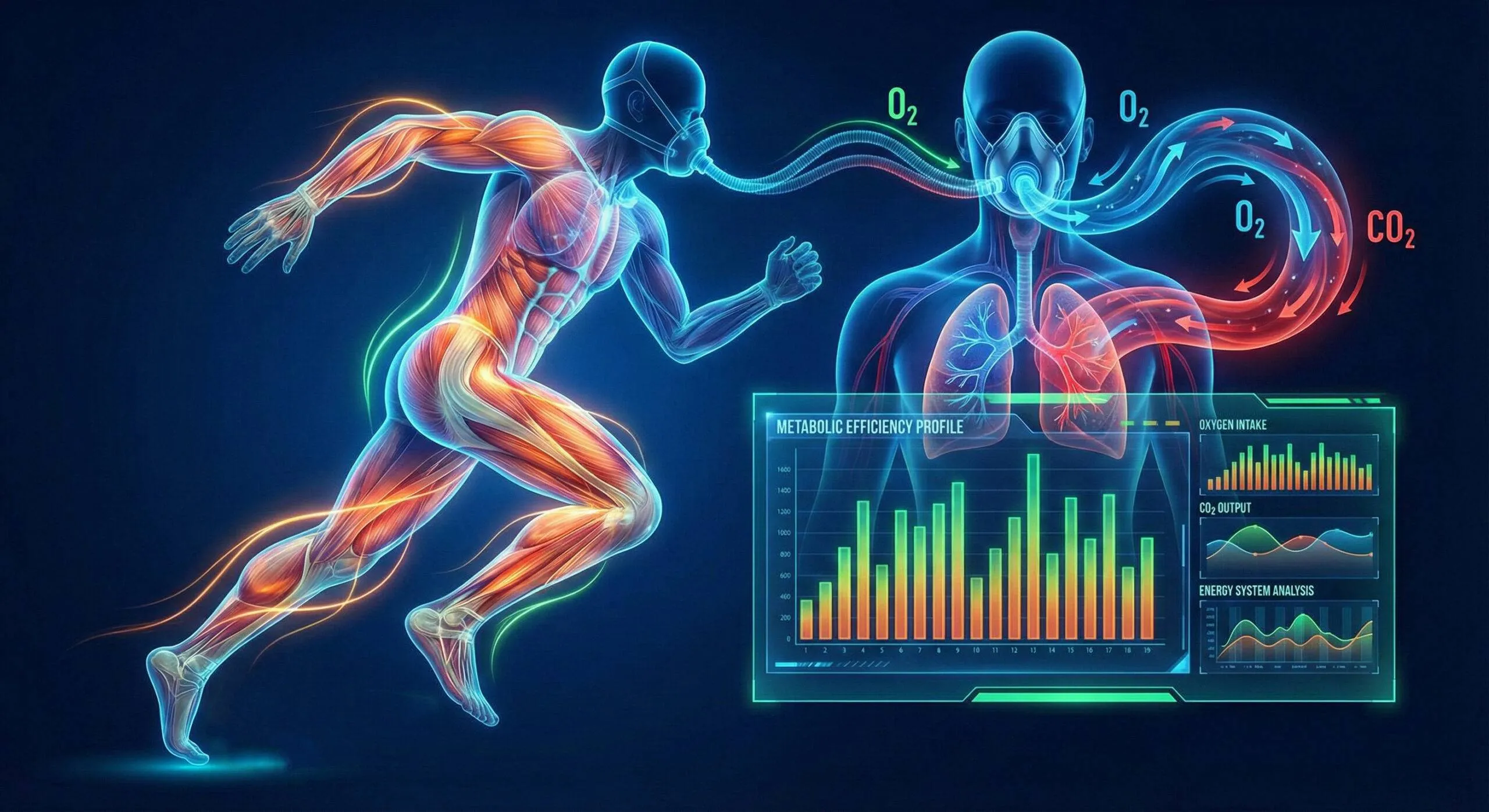 The Fluid Active Metabolic Rate Assessment uses clinical VO₂ and CO₂ analysis combined with biomechanical breath mechanics to reveal how efficiently you actually produce energy.